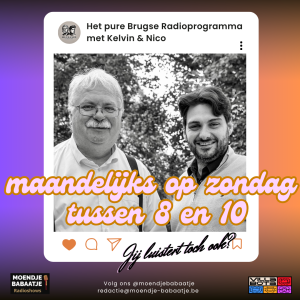 Kelvin en Nico maken elke maand een radioshow van 8 tot 10 op zondagmorgen. Dit doen ze samen met de Bruggelingen. Zo is er ook de weerman van Radio2: Geert Naessens en heeft Koen De Brabander ook zijn vaste rubriek, Brugge vroeger en heden. Allemaal mensen met de passie radio en een warm hart voor Brugge. Zelf meewerken aan Moendje Babaatje? Dat kan, neem contact op via redactie@moendje-babaatje.be.